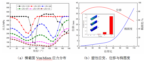 圖5(b)中,當徑厚比為60時(shí),管道未出現塑性變形。隨著(zhù)徑厚比增大,管道的塑性應變和塑性變形區域均增大。塑性變形區最先出現在管道頂部,隨著(zhù)徑厚比增大,管道兩側也逐漸進(jìn)入塑性區。對于薄壁管道,地表堆載作用下易出現凹陷,截面呈新月形。隨著(zhù)徑厚比增大,管道沉降量先增大后減小,管道臨界徑厚比為60;當徑厚比小于60時(shí),管道處于彈性變形階段,地表堆載作用下管道彎曲應變非常小,管道沉降量隨著(zhù)徑厚比增加而增加;當徑厚比大于60時(shí),管道進(jìn)入塑性階段,薄壁管道吸收了較多附加能量,因而,管道沉降量隨著(zhù)徑厚比增大而減小。管道截面橢圓度隨著(zhù)徑厚比增大而增大,且其變化率也逐漸增大。