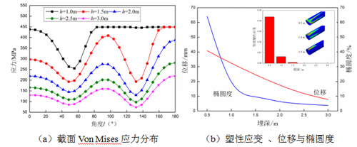 圖6(b)所示管道最大等效塑性應變隨著(zhù)埋深的增加而減小。當埋深大于1.5 m時(shí),管道未出現塑性變形;而當埋深小于0.5 m時(shí),管道變形非常嚴重,出現了較大凹陷區域。管道沉降量隨埋深的增加而減小,當埋深為3.0 m時(shí),沉降量?jì)H為7.83 mm。管道截面橢圓度也隨著(zhù)埋深的增加而減小,且變化率也逐漸減小。當埋深為1.5 m時(shí),管道橢圓度為9.6%。在彈性變形階段,管道橢圓度變化率非常小。因而,增加埋深是降低地表堆載影響的有效途徑之一。