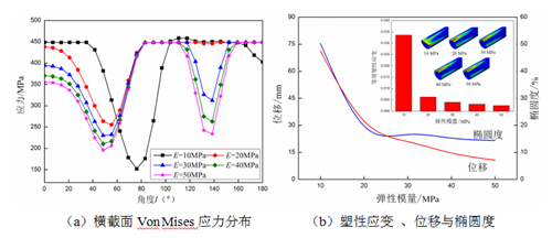 圖7(b)中,管道最大等效塑性應變隨著(zhù)圍土彈性模量增加而減小。當E≥20 MPa時(shí),管道塑性應變變化率非常小,且塑性應變分布較為接近。但當E=10 MPa時(shí),管道卻出現了較為嚴重塑性區,因而,在敷設管道回填時(shí),需要嚴格關(guān)注回填土的選擇。埋地管道的沉降量和截面橢圓度均隨圍土彈性模量的增加而減小,但其變化率也逐漸減小。