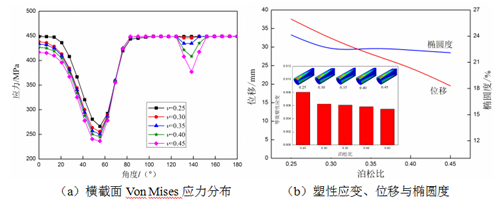 不同泊松比圍土中埋地管道的應力應變響應如圖8所示,管道應力分布基本相同。管道高應力區隨著(zhù)圍土泊松比的增大而減小,但變化率較小。不同泊松比圍土中的管道塑性應變分布也基本相同,最大等效塑性應變均出現在管頂,但它隨著(zhù)圍土泊松比的增大而減小,當泊松比大于0.3時(shí),塑性應變的變化率較小。管道沉降量和截面橢圓度均隨著(zhù)圍土泊松比的增大而減小,當泊松比大于0.3時(shí),管道橢圓度變化較小。