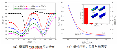 圖9(b)中,當c>30 kPa時(shí),管道不會(huì )出現塑性變形。管道最大等效塑性應變和塑性變形區均隨圍土黏聚力的增大而減小。當c=40 kPa時(shí),管道塑性變形區非常小。管道沉降量和截面橢圓度均隨圍土黏聚力的增大而減小。在管道發(fā)生屈曲以前(c ≥30 kPa),管道沉降量和截面橢圓度的變化率均非常小。因而,對于有埋地管道的砂土地層、粉土地層或其他黏聚力較小土體,必須嚴格控制地表載荷的大小,降低埋地管道的失效幾率。