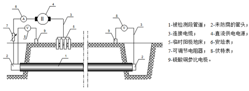 為保證回拖管道今后的安全運行,需對穿越管段的防腐層完整性進(jìn)行評估。評估方法是根據測試埋地管道的電阻(圖2),推算出涂層缺陷處的直徑當量,從而得出防腐層破損率,最后根據防腐層破損情況在兩岸設置適當數量的犧牲陽(yáng)極,以確保管道不被腐蝕。