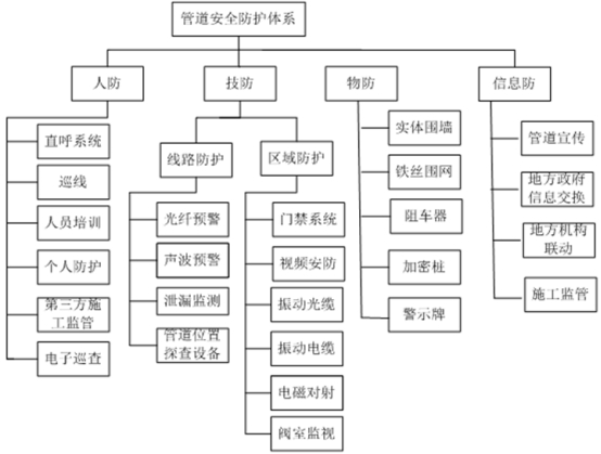 人防、物防、技防、信息防是一個(gè)有機整體,任何一個(gè)手段單獨使用都無(wú)法實(shí)現管道安全防護的目標。從相互關(guān)系上來(lái)看,人防是基礎,物防是補充,技防是提高,信息防是預測。各種物防措施主要起到警示和物理隔斷的作用,技防措施可以做到24 h不間斷的監控。管道安全防護是一個(gè)人防、物防、技防、信息防共同發(fā)揮作用的過(guò)程,各種防護措施之間構成縱深防護和互為冗余的關(guān)系。