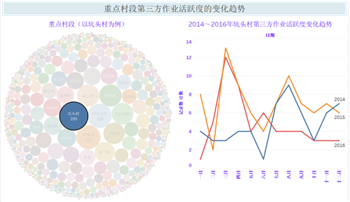 由于村/社區、鎮/街辦、區和市之間具有行政隸屬關(guān)系,我們可以利用該變量的分層鉆取功能,快速地在同一儀表盤(pán)中展現市、區、鎮/街辦等轄區內的施工活動(dòng)活躍程度,讓各區、各責任段的管道保護人員從中發(fā)現能指導自己工作的有價(jià)值的信息。從圖1可以看出,廣佛區的坑頭村、廟頭社區、里仁洞村、樟邊村、海傍村、金山村、鐘三村,東莞區的溫塘村,惠州區的黃漁涌村、南坑村內近三年施工活動(dòng)活躍度很高;而其中的坑頭村,2015年為近三年中活躍度最高的年份,盡管各年逐月變化的趨勢不盡相同,但每年的3月、4月及8月、9月份基本達到當年峰值,呈現出明顯的活躍期。圖1及圖2的可視化及分析結果,有助于管道安防人員通過(guò)增加相應時(shí)段的管道巡查頻率、加強管道保護宣傳和外事協(xié)調來(lái)預警和管控施工活動(dòng)違規行為。