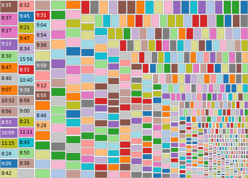 運用數據可視化軟件的“樹(shù)地圖”功能,在連接到數據源后,依次雙擊字段“記錄數”和“時(shí)間”,再單擊“智能顯示”下拉菜單選項中的“樹(shù)地圖”,然后將“時(shí)間”字段拖曳到標記“顏色”框中,即可實(shí)現第三方作業(yè)時(shí)間的可視化(如圖3)。圖中顏色深淺和方塊順序(自上而下,自左至右)分別表示同一作業(yè)時(shí)間所包含事件記錄的多少。