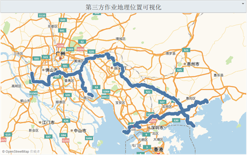 在圖4基礎上,利用TABLEAU的篩選器和標記面板框,對施工活動(dòng)數據維度中“風(fēng)險等級”、“所用器具”等想要可視化的字段進(jìn)行拖放,可以在管道路由圖上實(shí)現施工活動(dòng)風(fēng)險等級及其所用機具分布范圍的可視化(如圖 5)。管道安防人員利用此分析結果,可以適時(shí)調整安防力量的現場(chǎng)布控,并向屬地政府相關(guān)部門(mén)及時(shí)傳達或展示管道安保管理現狀,提高管道安防內外溝通的效率和水準。