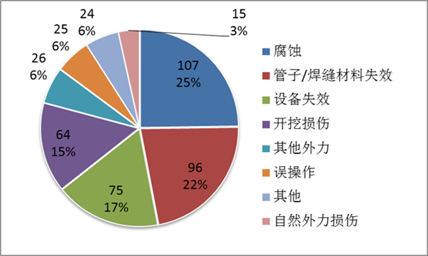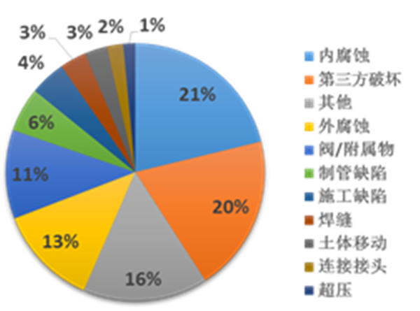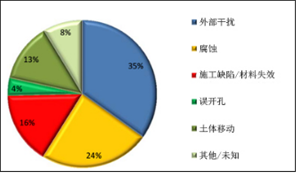 原油、天然氣管道失效原因按比例高低均分別為:內腐蝕、第三方破壞和外腐蝕(圖17、18)。