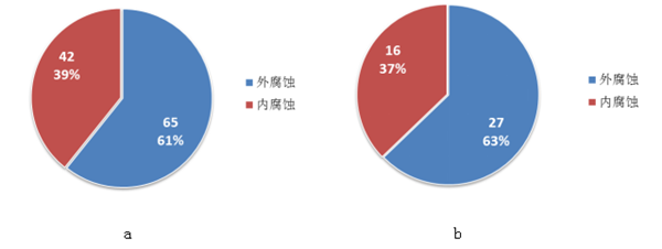 腐蝕是液體管道失效的首要因素;排在氣體管道失效因素的第3位。腐蝕失效中外腐蝕因素占60%以上,主要以電偶腐蝕為主,內腐蝕主要以微生物腐蝕為主(圖5 a、5 b)。