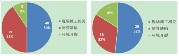 (2)國內外管道因管體/焊縫材料缺陷(制造缺陷+施工缺陷)導致失效的比例都較高。隨著(zhù)制管技術(shù)和質(zhì)量控制的提升,管體缺陷能夠得到有效控制;但現場(chǎng)施工由于受到各方面條件限制,質(zhì)量難以保證,環(huán)焊縫缺陷、凹陷、劃傷等缺陷還將不同程度的存在。