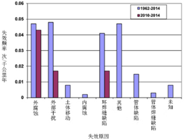 主要失效原因包括外腐蝕、外部干擾和環(huán)焊縫缺陷。管體缺陷和制管焊縫缺陷導致的失效在近5年(2010-2014年)沒(méi)有發(fā)生(圖21),這與制管水平的提高有較大關(guān)聯(lián)。