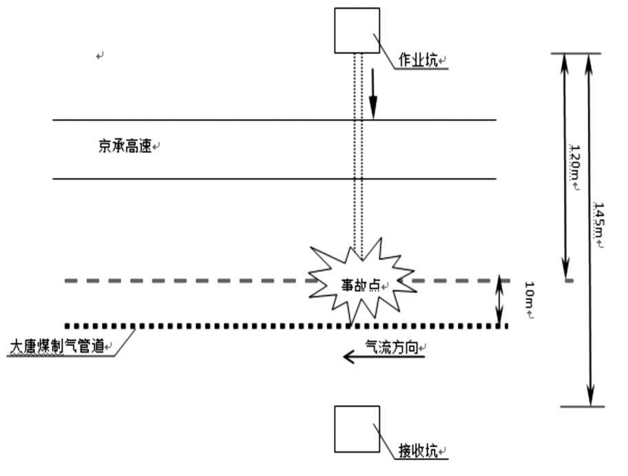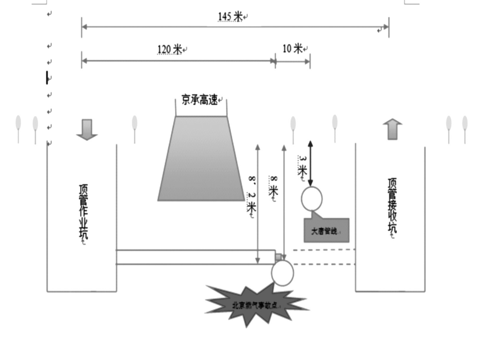 南水北調來(lái)水調入密云水庫調蓄工程的配套電纜管道(DN1050砼管)工程在事故點(diǎn)附近由北向南同時(shí)從地下穿越京承高速、北京燃氣集團管道、大唐管道。工程采用機械頂管作業(yè)方式,頂管管頂深7米(頂管機機頭底距地面8.2米)。此處北燃管道管頂埋深8米,大唐管道管頂埋深3米(與頂管機機頭凈空約為3米)。由于事先不知道有北京燃氣集團管道的存在,機械頂管直接導致該管道泄漏。