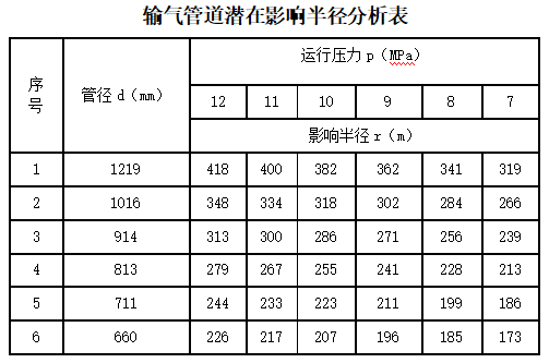 從上表數據可以看出,當管徑為1219毫米,壓力為12MPa時(shí)(如西氣東輸二線(xiàn)等),其潛在影響半徑達到418米。