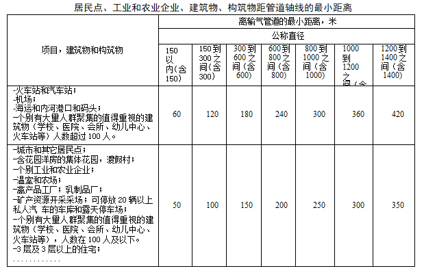 (2)俄羅斯聯(lián)邦《大型管道壓力大于10MPa時(shí)的設計標準》(ГОСТ Р55989-2014)相關(guān)規定。該標準規定了居民點(diǎn)、工業(yè)(農業(yè))企業(yè)、建筑物、構筑物距干線(xiàn)輸氣管道的最小距離(見(jiàn)下表)。其中屬于人口密集的火車(chē)站、汽車(chē)站、機場(chǎng)、學(xué)校、醫院、會(huì )所等(相當于我國標準規定的4級地區)距干線(xiàn)管道的距離,按照管道直徑150—1400毫米等7個(gè)檔次,規定最小距離為60米,最大距離為420米。城市和居民點(diǎn)、3層及3層以上住宅距干線(xiàn)管道的距離,按照管道直徑150—1400毫米等7個(gè)檔次,規定最小距離為50米,最大距離為350米。