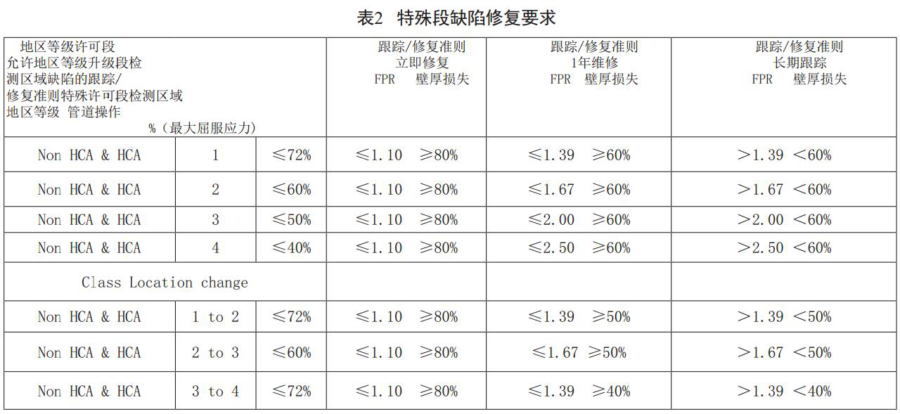 PHMSA要求運行商按表2修復特殊段的缺陷 , 同 時(shí) 特 殊 地 段 之 外 的 管 段 要 符 合 4 9 C F R192.111管道設計系數要求。