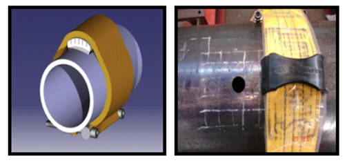 北京華油國際物流工程服務(wù)有限公司在凱夫拉纖維的基礎上,自主研發(fā)了油氣管道柔性帶壓快速堵漏套具(如圖4所示)。該套具可以對不同管徑直管段、彎頭、焊縫、變徑等部位的泄漏進(jìn)行應急堵漏,適用于直徑小于50毫米、壓力不大于10MPa的泄漏。其最大的特點(diǎn)是,可以實(shí)現在帶壓工況下快速完成對管道泄漏部位的封堵。該產(chǎn)品已經(jīng)中石油管道應急搶險中心、西部管道公司、西氣東輸公司、中海油工程服務(wù)有限公司等多家單位現場(chǎng)試驗,堵漏效果良好。
