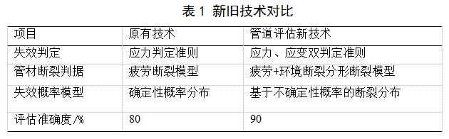 相繼完善了管道氫致開(kāi)裂、焊縫、平面型缺陷、體積型缺陷、管道不同損傷狀況的評估理論。研究了在線(xiàn)、離線(xiàn)管道評估技術(shù),提出了氫致開(kāi)裂斷裂判據,建立了含H2S管道安全評價(jià)模型和失效評定圖,解決了管道完整性評估理論與生產(chǎn)實(shí)踐脫節的問(wèn)題[5]。并首次建立了基于應力和應變雙重判據的管道失效評估方法,發(fā)現并揭示了管材氫致開(kāi)裂韌脆硬化分形擴展機理,重構了失效模型和評定圖;基于應力-強度干涉理論[6],建立了不確定性條件下管道的失效概率模型。新理論和新方法評估準確度提高10%,詳見(jiàn)表1。
