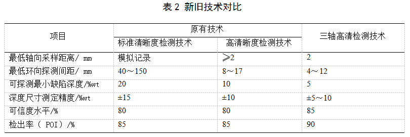 中國管道檢測公司、沈陽(yáng)工業(yè)大學(xué)、中國石油大學(xué)(北京)等聯(lián)合研發(fā)三軸高清漏磁內檢測、全向勵磁漏磁檢測技術(shù)及系列裝置,發(fā)明了多通道高精度變形檢測裝置和管道應變監測系統。該系列裝置傳感器(圖2采用XYZ三維立體分布代替傳統單軸分布,開(kāi)發(fā)新型集成固化耦合傳感器和全數字化三維漏磁信號采集系統。使國內檢測技術(shù)指標值大幅提升,檢測缺陷深度門(mén)檻值壁厚由20%提高到5%(國際檢測指標),檢出率(POI)提高5%,達到90%[8-9],詳見(jiàn)表2。