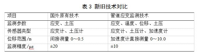 多通道高精度變形檢測裝置和管道應變監測系統,采用高精度角位移傳感器、抗抖探頭擺動(dòng)裝置和拓撲算法代替原有直位移傳感器和模擬算法,提高了定位精度;采用振弦式高精度抗干擾傳感器,實(shí)時(shí)精準監測高風(fēng)險點(diǎn)管道應變,采集精度指標達到±10με(微應變),實(shí)現了管道應變數據采集策略的自動(dòng)控制及遠程維護(表3)。