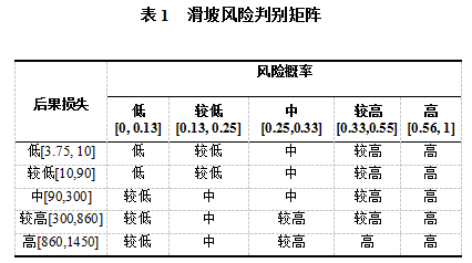 最終,通過(guò)災害風(fēng)險概率和管道失效后果構建風(fēng)險矩陣,判別滑坡風(fēng)險(表1)。