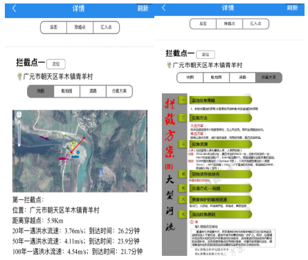 公司研制的水系圖及水系應急防控平臺的主要功能包括水系圖制作、穿越點(diǎn)和攔截點(diǎn)定位、線(xiàn)路走向定位、航拍圖與影像圖編輯、測距、河流洪水流速及到達關(guān)鍵點(diǎn)時(shí)間計算、物資類(lèi)型與存放位置以及攔油方案等。圖7為平臺APP攔截點(diǎn)信息和攔截方案界面展示。