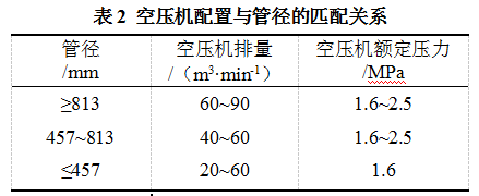 若空壓機排量過(guò)小,則進(jìn)氣量不足導致檢測器前進(jìn)速度過(guò)慢,甚至因檢測器兩端無(wú)法建立起足夠壓差而導致檢測器無(wú)法正常運行。若排量過(guò)大,檢測器運行速度會(huì )過(guò)快而影響數據質(zhì)量,嚴重情況下可導致檢測器撞擊盲板致使檢測器和收球筒損壞?諌簷C的排量、壓力、數量需求宜根據現場(chǎng)環(huán)境及管道屬性等因素綜合確定,建議如表2所示。若線(xiàn)路較長(cháng)、落差較大、管內存水過(guò)多,智能測徑除加強空壓機配置外,還需配備增壓機。