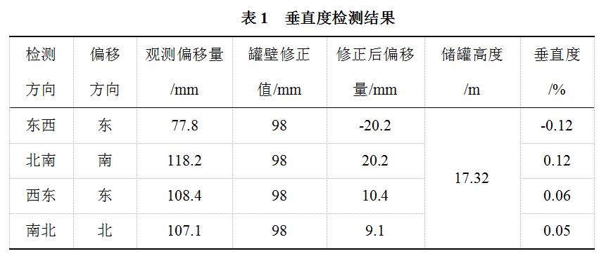 2017年8月24日進(jìn)行了垂直度檢測,利用MS05型全站儀自由設站測量罐體同一垂線(xiàn)頂部及底部的水平距離,觀(guān)測方向為東西、北南、西北、南北四個(gè)方向。以測量?jì)揄敳亢偷撞康木嚯x計算罐體頂部檢測點(diǎn)相對于罐體底部檢測點(diǎn)的傾斜方向,結果見(jiàn)表1。檢測結果符合《油罐的檢驗、修理、改建及翻建》(SY/T 6620―2014) 10.5.2.1 “罐壁頂部相對于罐壁底部的不垂直度不應超過(guò)油罐總高度的1%,但最大為127mm”。