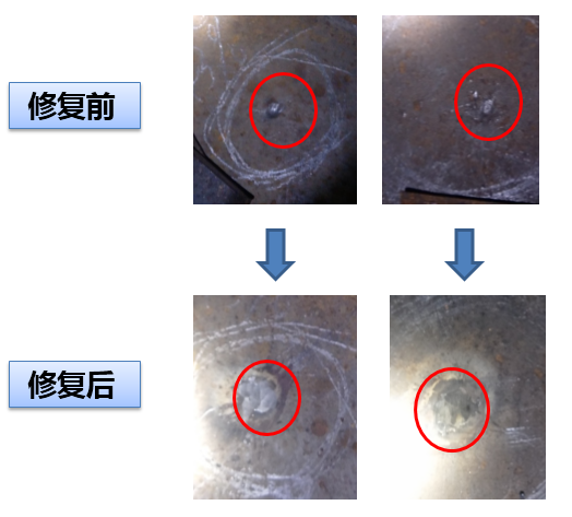 2017年11月23日對儲罐底板進(jìn)行了漏磁檢測(圖 3),紅點(diǎn)處為底板表面發(fā)現腐蝕缺陷,共計13處(直徑5 mm,深度3 mm)(圖4),。根據漏磁檢測結果開(kāi)展了儲罐底板缺陷點(diǎn)修復工作,修復前后對比見(jiàn)圖5。