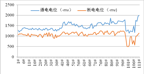 根據GB/T 21246―2007《埋地鋼質(zhì)管道陰極保護參數測量方法》,利用GPS同步電流中斷器以瞬間斷電法測試該管道陰極保護通電、斷電電位,結果分別為-1 203 ~-2 000 mV,-490 ~-1 250 mV,如圖2所示。結果顯示100#—102#、105#—-107#樁處管道斷電電位未達標,該處管道欠保護。