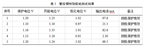測試5個(gè)臨時(shí)犧牲陽(yáng)極測試樁的保護電位、開(kāi)路電位、極化電位、輸出電流,結果(表1)顯示,各臨時(shí)犧牲陽(yáng)極陰極保護有效。