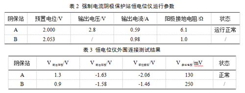測試2個(gè)陰保站恒電位儀運行參數及外圍連接,結果如表2、表3所示,各陰保站恒電位儀運行狀態(tài)均正常。