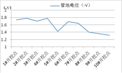 采用近參比法對10處開(kāi)挖點(diǎn)進(jìn)行管地電位測試,管地電位-1.32 ~-1.78 V(圖3)。