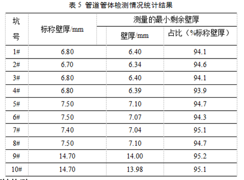 采用超聲波測厚方法[5]檢測管道壁厚,結果(表5)顯示,最小剩余壁厚是標稱(chēng)壁厚的93.9%~95.1%。