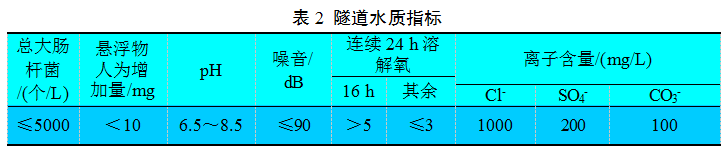 隧道水質(zhì)檢測指標見(jiàn)表2。其中,懸浮物質(zhì)沉積于底部后不得對魚(yú)、蝦、貝類(lèi)產(chǎn)生有害的影響,生化需氧量(COD)小于5 mg/L,5天化學(xué)需氧量(BOD)不超過(guò)2 mg/L。