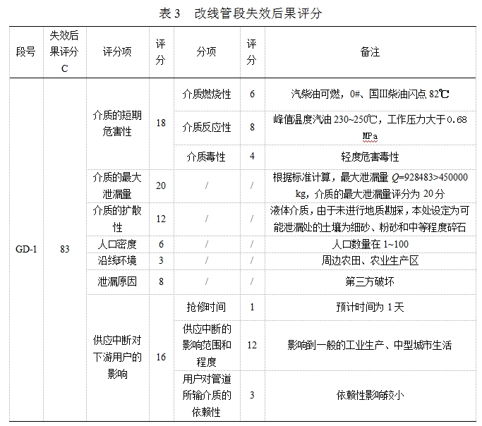 根據前文提出的改線(xiàn)管段風(fēng)險評估方法,改線(xiàn)管段GD-1的失效后果評分如表3所示。