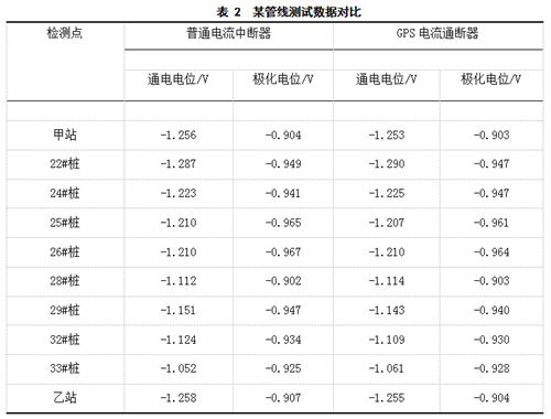 測試人員首先在甲、乙兩站架設普通電流中斷器進(jìn)行同步通斷測試,沿管線(xiàn)選擇10個(gè)點(diǎn)進(jìn)行極化電位測試,完成后又立即將電流中斷器更換為研發(fā)的GPS電流通斷器,再次對之前選點(diǎn)進(jìn)行數據收集,測試過(guò)程中,兩站GPS顯示時(shí)間同步,且通斷電位在15 s周期內無(wú)波動(dòng)。測得數據對比見(jiàn)表2。
