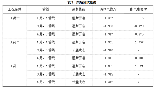 測試人員將GPS電流通斷器多路樣機接入恒電位儀,控制A管線(xiàn)、B管線(xiàn)和 C管線(xiàn)三路通斷① 用恒電位儀1、3、4路分別向A管線(xiàn)、B管線(xiàn)和、C管線(xiàn)進(jìn)行送電。設置好樣機運行模式,對三路輸出進(jìn)行同步通斷電;② 在連接不變的情況下,對1、4路通斷,3路不通斷;③ 在連接不變的情況下,對1路通斷,3、4路不通斷。測試過(guò)程中,恒電位儀運行正常,萬(wàn)用表測試電位示數穩定,測試結果見(jiàn)表 3。