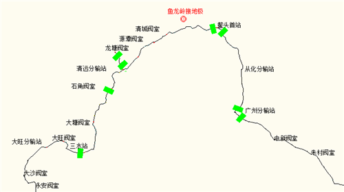 圖 3 魚(yú)龍嶺接地極與廣東管網(wǎng)管道相對位置示意(方塊為絕緣接頭)