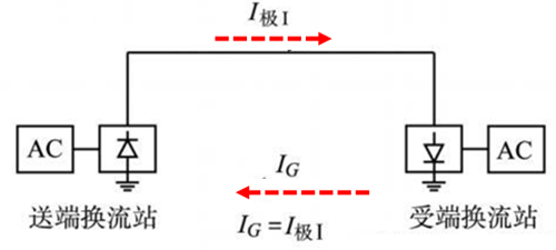 在單極大地回路電流運行方式中,利用一根或兩根導線(xiàn)和大地構成直流側的單極回路,見(jiàn)圖4。在該運行方式中,兩端換流站均需接地,大地作為一根導線(xiàn),通過(guò)接地極入地的電流即為直流輸電系統的運行電流。