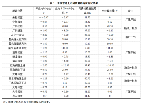 在魚(yú)龍嶺接地極故障陰極放電時(shí),測試了廣東管網(wǎng)一期管道不同位置的管道通電電位(表 1)。