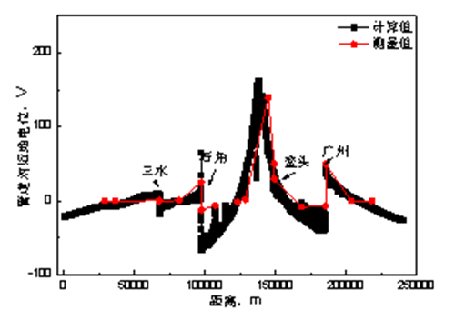 圖14 管道受高壓直流輸電系統接地極干擾電位分布