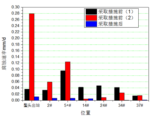 圖16 采取措施前后試驗段管道的腐蝕速率