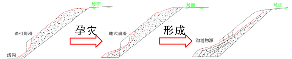 圖2 侵蝕型坡面泥石流物源補給演化模式