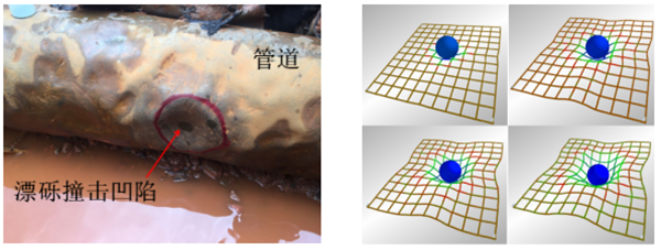 (a.撞擊照片;b.漂礫撞擊管道變形平面投影示意圖)