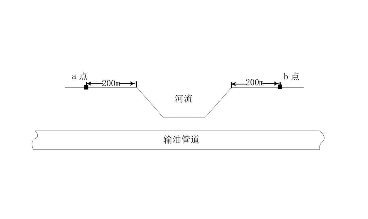 圖2是管道兩側地勢高差一側低,一側高的情況,高后果區邊界正常設定在b、c兩點(diǎn),其中b點(diǎn)滿(mǎn)足在管道泄漏后,油流可以克服阻力逆向流入河流中的最遠距離,由于確認b點(diǎn)需要考慮較多因素,確認難度較大,出于安全范圍考慮,建議選擇a點(diǎn)、b點(diǎn)。