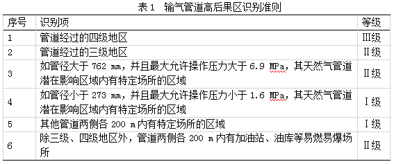高后果區指的是管道泄漏后可能對公眾和環(huán)境造成較大不良影響的區域(圖 1)。根據GB 32167―2015,輸氣管道沿線(xiàn)高后果區主要包括以下區域:①管道經(jīng)過(guò)的三級地區、四級地區;②管道潛在影響區域內有醫院、集市、學(xué)校、托兒所、幼兒園等人群疏散困難的特定場(chǎng)所;③管道中心線(xiàn)兩側各200 m范圍內有化工廠(chǎng)、加油站、油庫等易燃易爆場(chǎng)所。共分為Ⅰ、Ⅱ、Ⅲ三個(gè)等級,其中Ⅰ級表示最小的嚴重程度,Ⅲ級表示最大的嚴重程度。輸氣管道高后果區識別準則見(jiàn)表1。