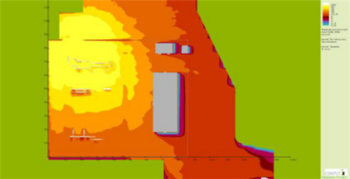 (1)應用三維CFD軟件模擬天然氣站場(chǎng)泄漏導致的噴射火火災,分析火災影響范圍(圖 6)。對比CFD模擬結果與現場(chǎng)事故勘察和過(guò)火痕跡,呈現較好的一致性。