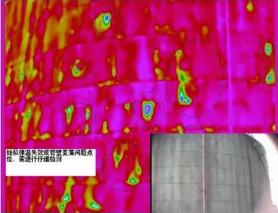采用定點(diǎn)熱成像儀進(jìn)行監測,可清晰識別保溫失效程度,提供重點(diǎn)點(diǎn)位進(jìn)行掃描檢測,為辨別保溫層脫落或罐壁腐蝕失效提供預處理定位依據。