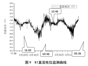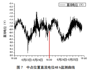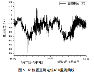 可以看出,管道電位變化的極值與潮汐產(chǎn)生的高潮和低潮時(shí)間點(diǎn)有極大相關(guān)性,均是在高潮時(shí)管道電位正向偏移,低潮時(shí)管道電位負向偏移。因此推斷直流電位波動(dòng)受潮汐能干擾所致。