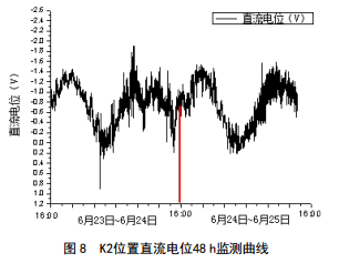 如圖 4所示,某管線(xiàn)K1―K2管段的65 km管道與海岸線(xiàn)并行, K2位置為該管段終點(diǎn),管道路由距離海岸10 km~15 km。日常測試中發(fā)現該管段直流通電電位間歇發(fā)生波動(dòng),且時(shí)間段比較規律。采用HC﹣069雜散電流記錄儀對管道直流電位進(jìn)行48 h監測,通電電位波動(dòng)情況如圖 5所示。針對規律性的電位波動(dòng)情況,將全線(xiàn)恒電位儀關(guān)機24小時(shí)后,再次48 h同步監測管道直流電位,監測位置有K1、 K1與K2中點(diǎn)、 K2。所得電位監測曲線(xiàn)如圖6~8所示。