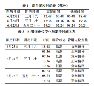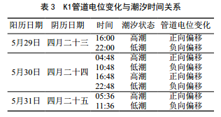 由圖 6~8可知,該段管道在48 h內電位波動(dòng)方向和強弱基本一致,可以看出該管段電位異常波動(dòng)為同一干擾源所致。該管段直流電位每天都有2次正向偏移和2次負向偏移(相較于自然電位﹣0.7 VCSE),在凌晨1:30電位達到最正,經(jīng)查詢(xún)煙臺潮汐時(shí)間表(表 1,來(lái)源于天氣網(wǎng)),對照監測管道電位波動(dòng)日期及時(shí)間, K1位置管道電位變化與潮汐時(shí)間關(guān)系如 表 2所示。